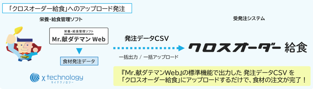 『クロスオーダー給食』はMr.献ダテマンWebの標準で出力できる”発注データCSV”の取込みに対応しており、食材発注業務のさらなる効率化を実現します。