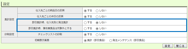③設定後は「閉じる」をクリックし、集計・発注メンテナンス(即日集計)画面に戻ると