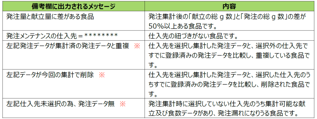※のメッセージは、設定>集計設定>即日集計時、仕入先別に発注集計「する」に設定している場合にのみ、