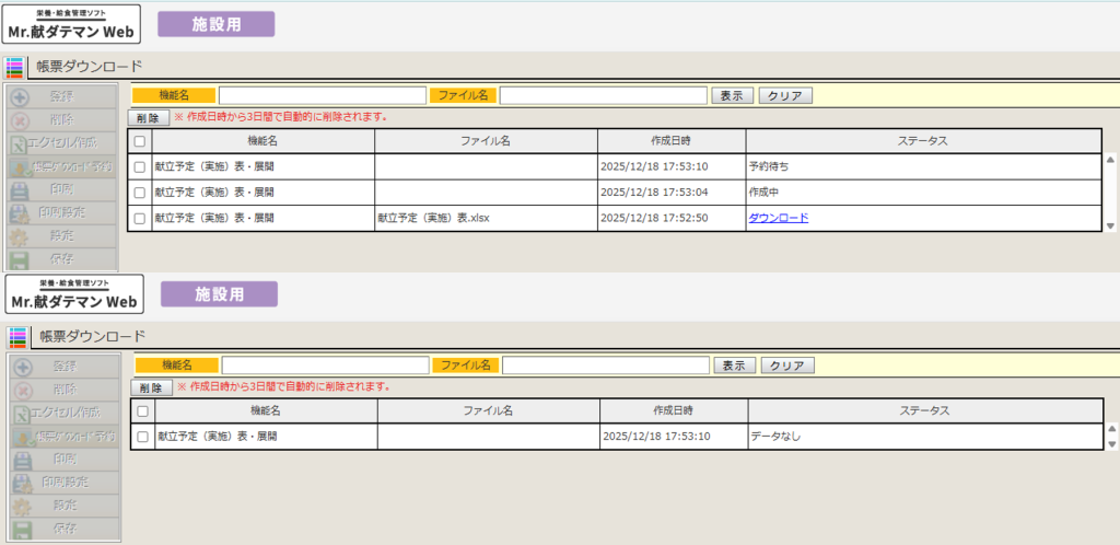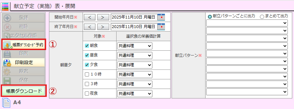 献立予定(実施)表・展開や栄養月報など、帳票により「エクセル作成」が非活性となっている場合があります。