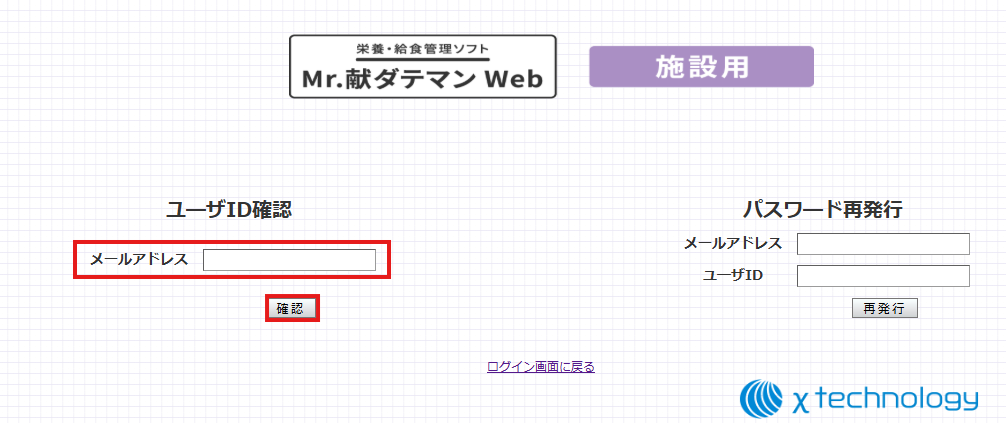 ②「ユーザID確認」の欄にメールアドレスを入力し、確認をクリックします。