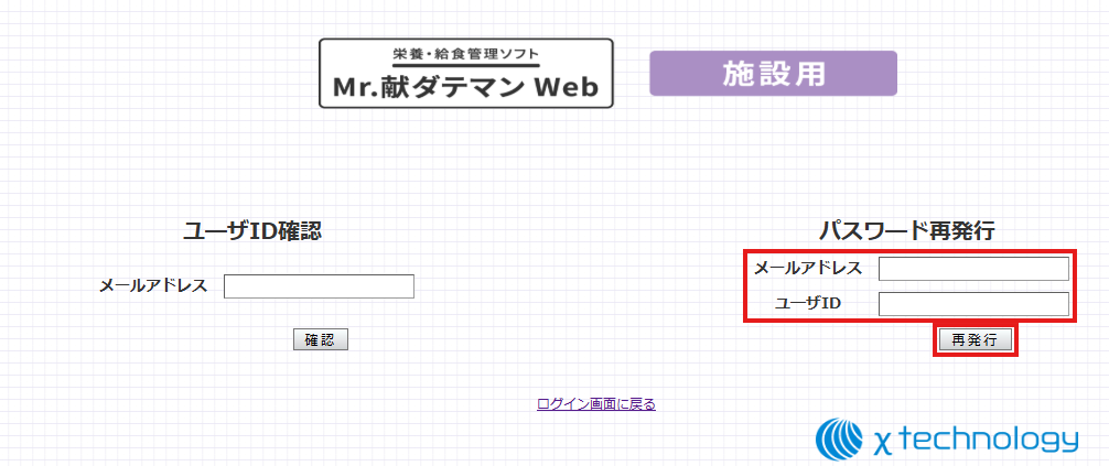 ②「パスワード再発行」の欄にメールアドレス・ユーザIDを入力し再発行をクリックします。