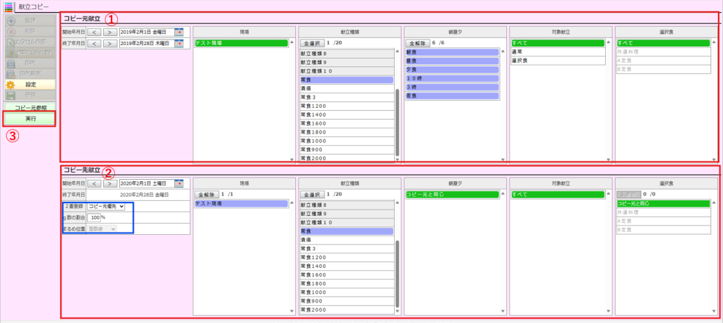 ①コピー元の献立期間(開始年月日・終了年月日)、現場、献立種類、朝昼夕、対象献立を選択します。