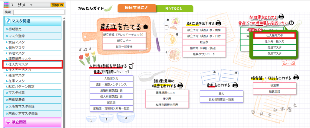 もしくは、毎日すること:発注書を出力する>仕入先マスタ から定休日の設定が可能です。