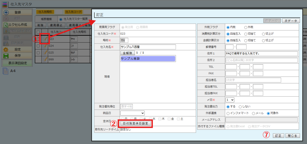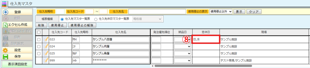 ⑧仕入先の一覧画面に定休日が反映されます。