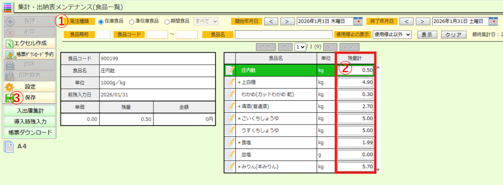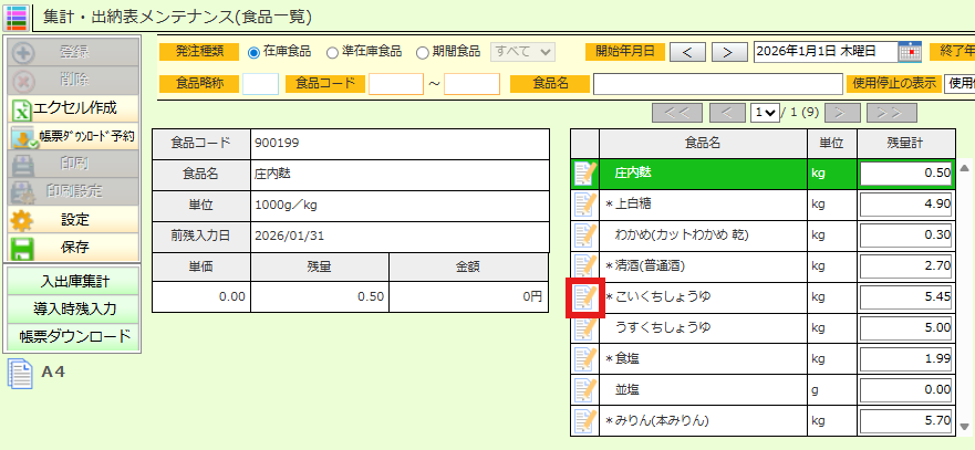 もしくは、時々すること:在庫管理を行う>集計・出納表メンテナンス の集計・出納表メンテナンス(食品一覧)画面で