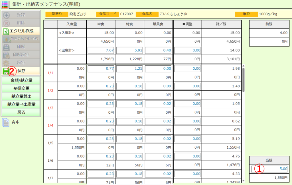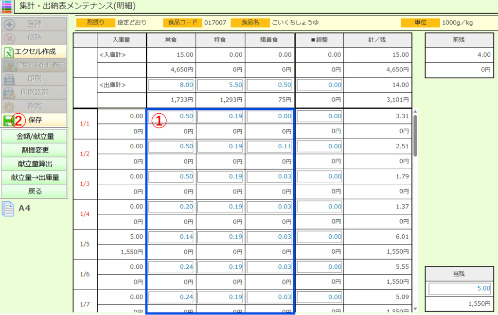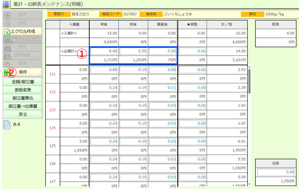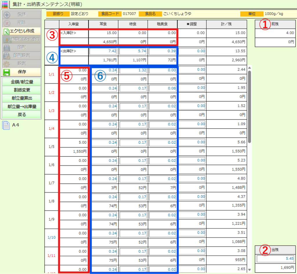 ⑥日々の出庫量・金額が反映されます。献立のg数×食数で計算した値が反映されます。