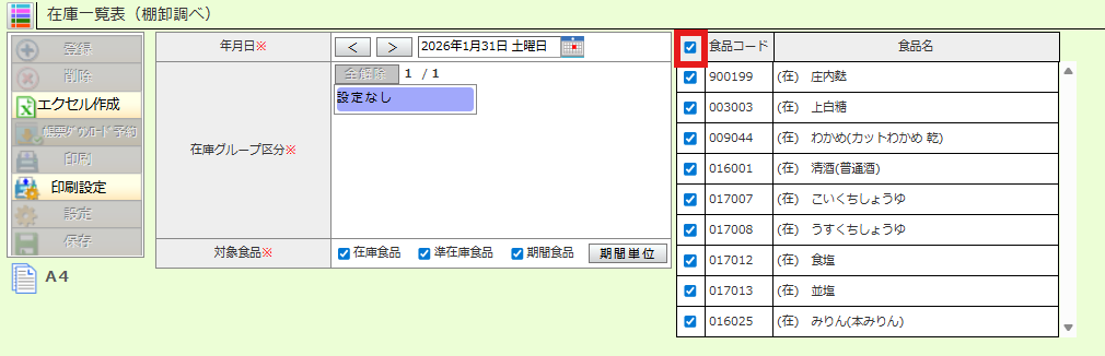 在庫一覧表に出力したい食品のみチェックを入れてください。