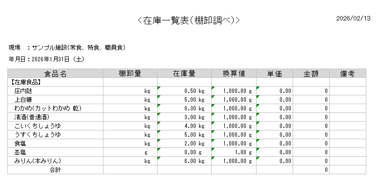 必要に応じて、食料品消費日計表、給食材料費平均・合計表、食品出納表、物品受払表などの在庫帳票を出力してください。