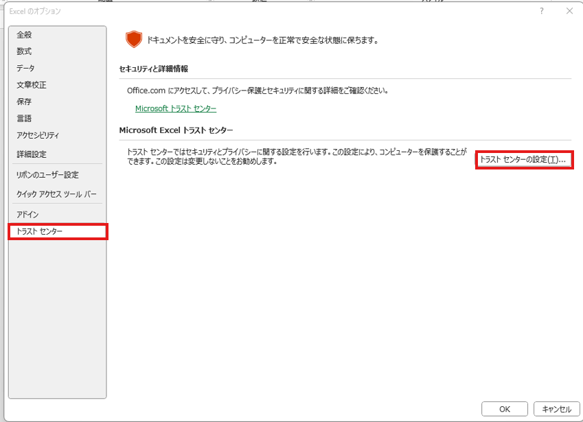 ※Officeのバージョンにより[トランスセンター]の名称が[セキュリティーセンター]の場合があります。