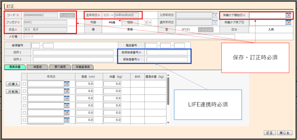 (例)栄養ケア対象者一覧の訂正画面