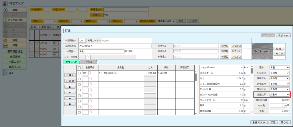料理マスタ>[分量比率]を対象外に設定することで、