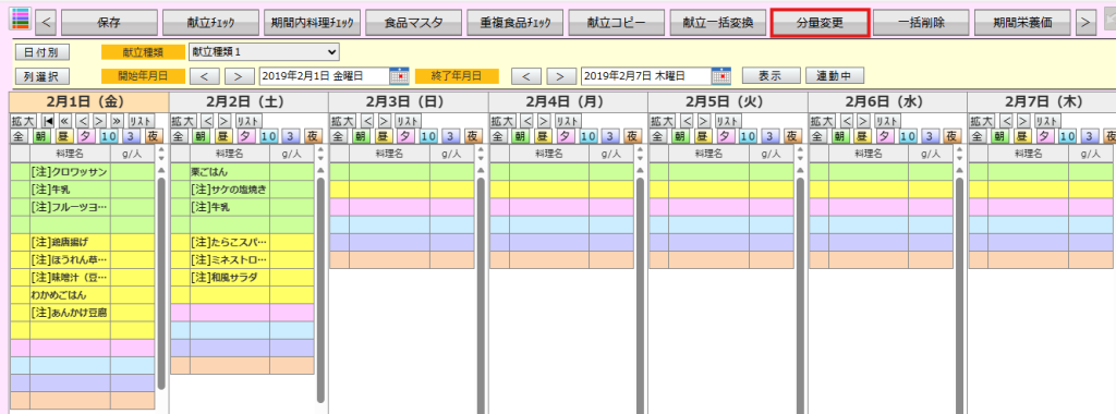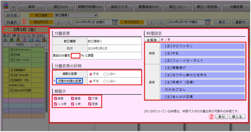 ②変更したい分量の割合・分量変更の反映・朝昼夕・料理設定で変更したい料理を選択し、[実行]ボタンを押下します。