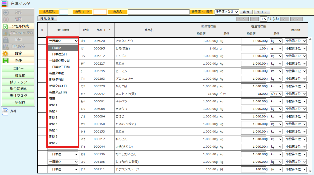 例えば在庫マスタで発注種類が「前々日単位」の食品でも