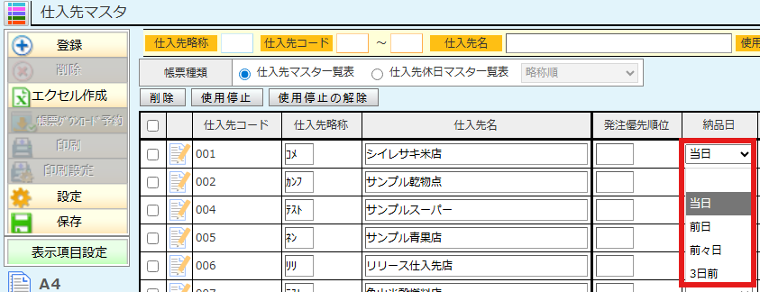 その食品の仕入先が、仕入先マスタで「前日納品」で設定されている場合は、前日納品となります。