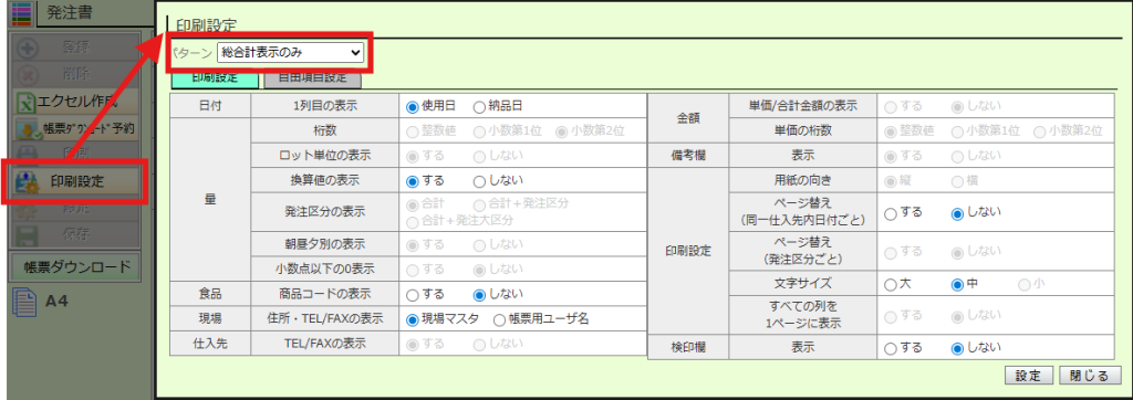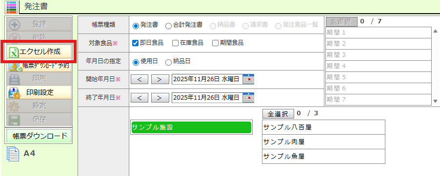発注書の画面で帳票種類・対象食品・年月日の指定・開始終了年月日・現場・仕入先を選択の上