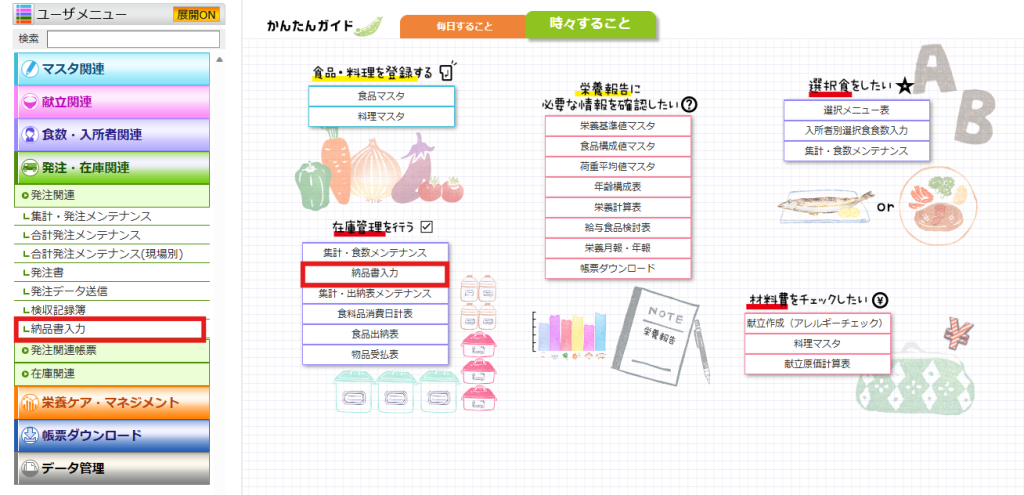 もしくは、かんたんガイド:時々すること>在庫管理を行う>納品書入力 から入力・確認が可能です。