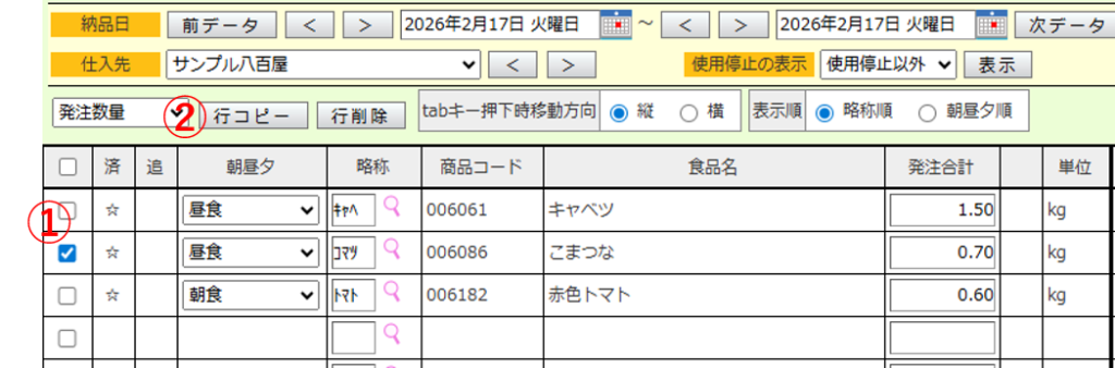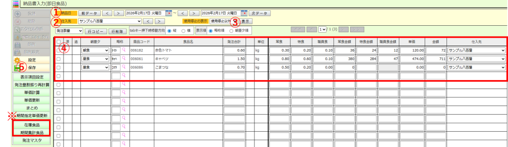 ④必要に応じて食品の追加・訂正・削除、使用日・納品日の変更、単価・金額の登録などを行います。