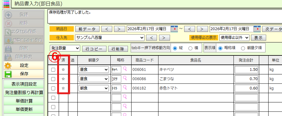 ⑥保存をすると「済」の列に☆が付きます。