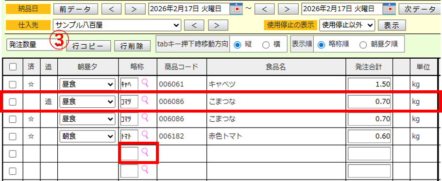 ③選択した行がコピーされますので、呼び出したい食品の呼出ワードを入力し、[虫眼鏡アイコン]を押下します。
