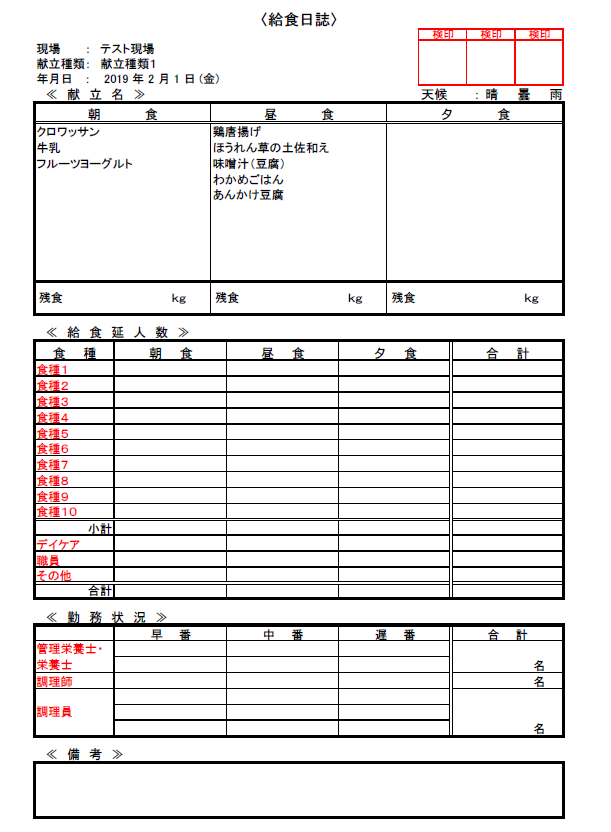 修正したい箇所が多い場合やオリジナルのレイアウトを作成したい場合は[給食日誌(自由レイアウト)をご使用ください。
