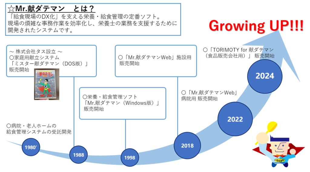 「Mr.献ダテマン」は1980年代前半に、女性起業家が病院や高齢者施設の給食管理を効率化するために開発したプロトタイプからスタート、「Mr.献ダテマン」DOS版はその後Windows版へと展開。 2000年以降は関連システムも次々リリースし、機能の幅を広げていきました。 さらに2018年には業界に先駆けてクラウド版を発表し、リモートワークやDX化を推進。 40年以上にわたり進化を続ける同シリーズは、全国の食の現場を支える最も選ばれる定番の給食システムとして、確固たる地位を築いています。