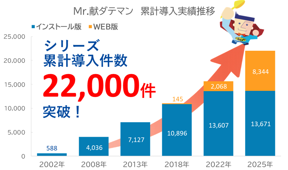 ※累計導入件数は、「Mr.献ダテマンインストール版」の出荷ライセンス数と、「Mr.献ダテマンWEB版」の契約事業所数の合計値です。